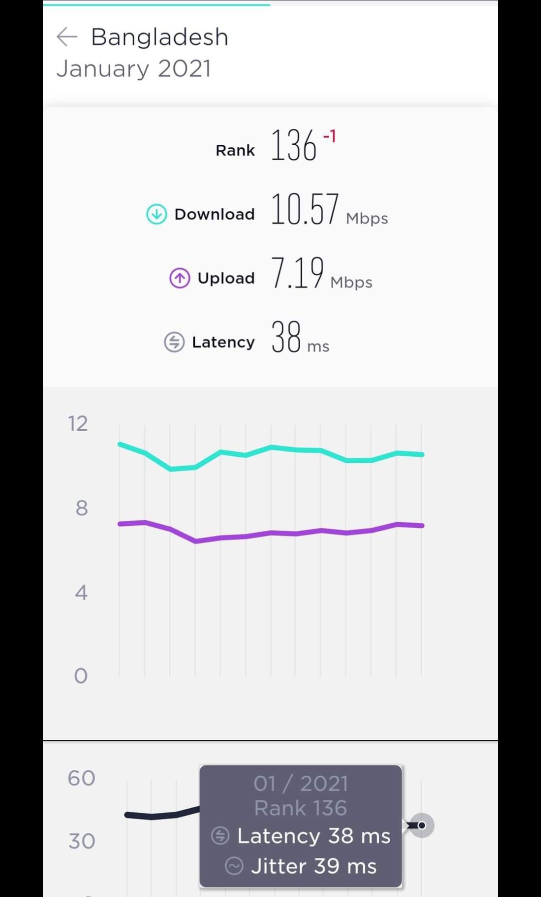ছবিতে দেখুন গড় ল্যাটেন্সি ৩৮ মিলি সেকেন্ড, একটা আদর্শ ত্রিজি নেটওয়ার্ক এ গড় ল্যাটেন্সি ১৫ থেকে ২০ মিলি সেকেন্ড থাকে। ফোরজি তে এটা ১০ থেকে ১৫ আদর্শ। বাস্তবে কিছু কম থাকে, তবে ৩৮ কোন ভাবেই ভালো মান নয়।