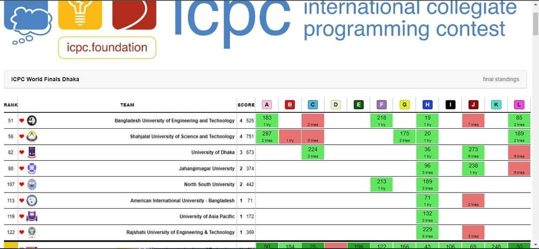 After completing the contest, final result of different champions has been published. Here are the university list of standings in different categories.