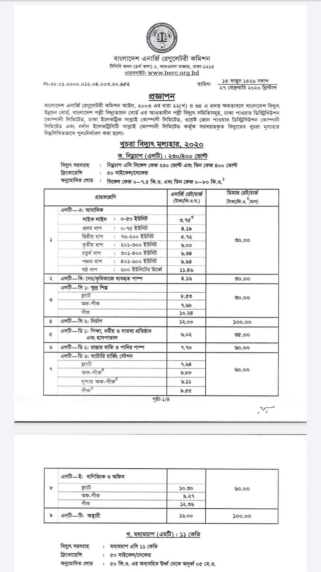 বাংলাদেশের বিদ্যুত ব্যবহারের বর্তমান মূল্য ধাপ (tariff) হলো (বাংলাদেশ এনার্জি রেগুলেটরি কমিশন এর প্রজ্ঞাপন ২০২০ অনুযায়ী) –
