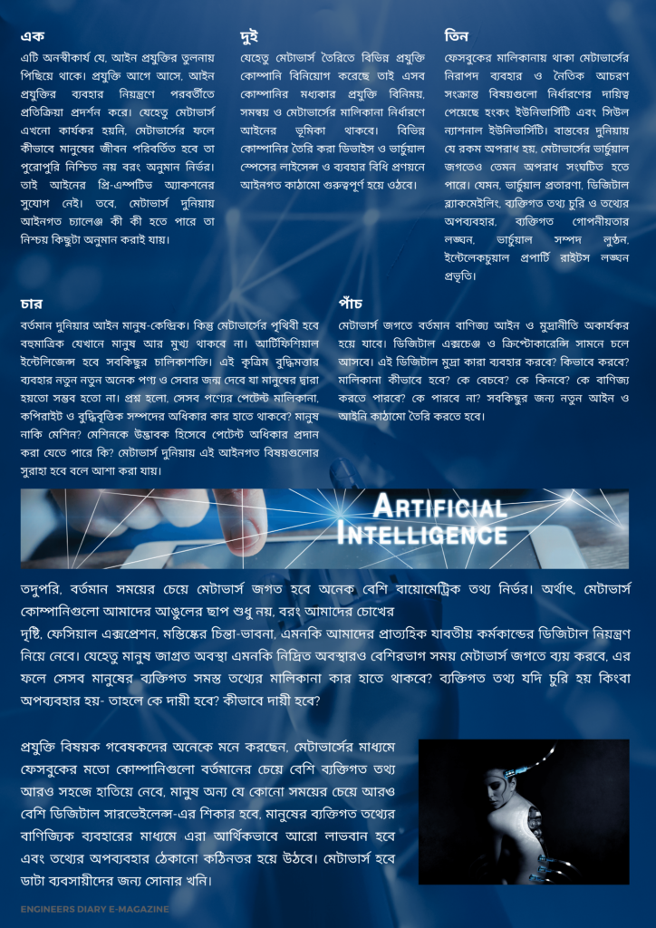মেটাভার্সের দুনিয়ায় জড়িয়ে যাবে মানুষের ব্যক্তিজীবন, পেশাজীবন, সমাজজীবন, শিক্ষা, অর্থনীতি, শিল্প, বিনোদনসহ প্রায় সব কিছুই। কিন্তু, মানবজীবন তো আর থ্রি-ডি ভিডিও গেইম নয়। তাই এই প্রযুক্তির ব্যবহার নিয়ন্ত্রণে আইনগত বিষয়গুলো কেমন হবে সেটিও বর্তমানে ভীষণ প্রাসঙ্গিক হয়ে ওঠেছে।