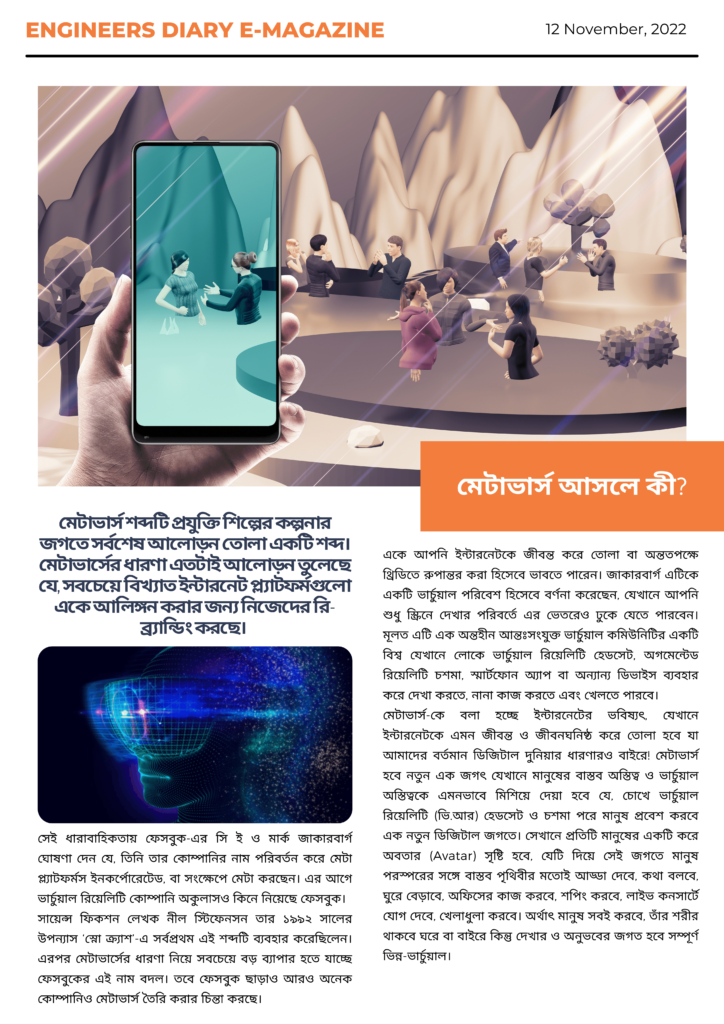 মেটাভার্স হবে নতুন এক জগৎ যেখানে মানুষের বাস্তব অস্তিত্ব ও ভার্চুয়াল অস্তিত্বকে এমনভাবে মিশিয়ে দেয়া হবে যে, চোখে ভার্চুয়াল রিয়েলিটি (ভি.আর) হেডসেট ও চশমা পরে মানুষ প্রবেশ করবে এক নতুন ডিজিটাল জগতে।