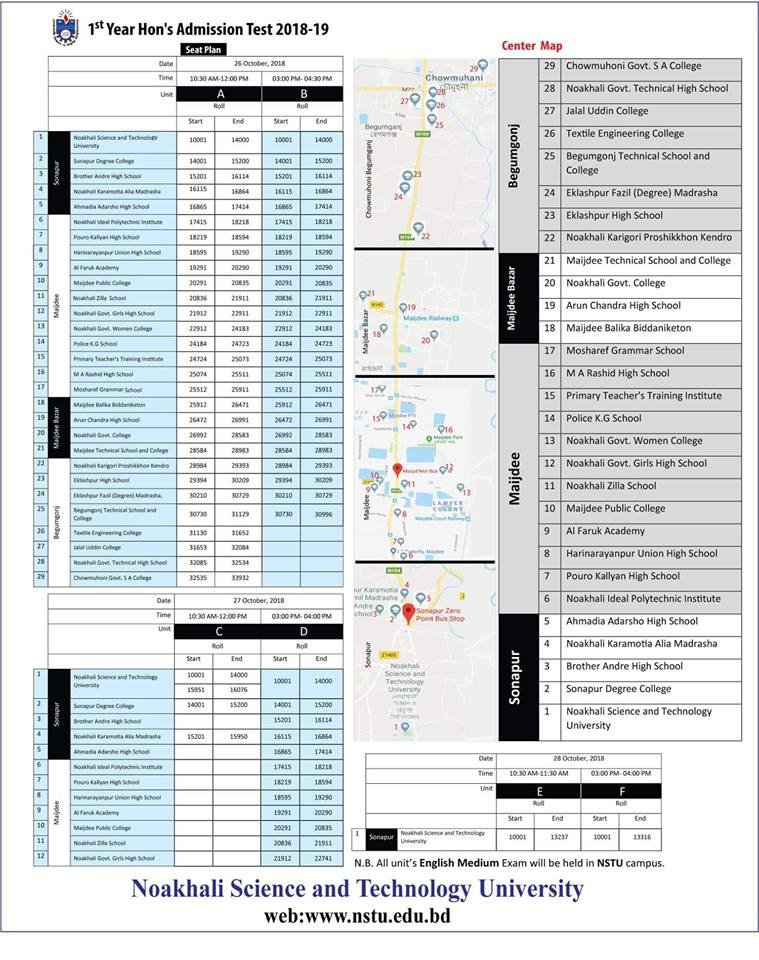 নোয়াখালী বিজ্ঞান ও প্রযুক্তি বিশ্ববিদ্যালয়ের আগামী ২৬-২৮ অক্টোবর অনুষ্ঠিতব্য ২০১৮-১৯ শিক্ষাবর্ষের ভর্তি পরীক্ষার আসন-বিন্যাস প্রকাশ করা হয়েছে।